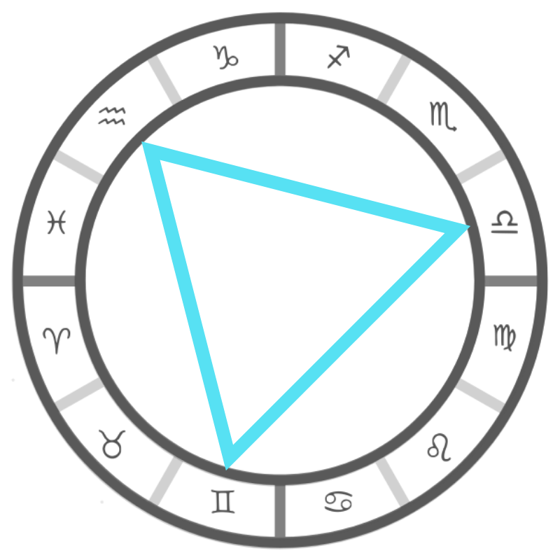 Dividing the horoscope wheel by three and connecting the points where the circle is intersected gives an equilateral triangle. Signs of the same element sit at the points of the triangle at 120° (four signs) apart. The Air signs are Gemini, Libra and Aquarius.