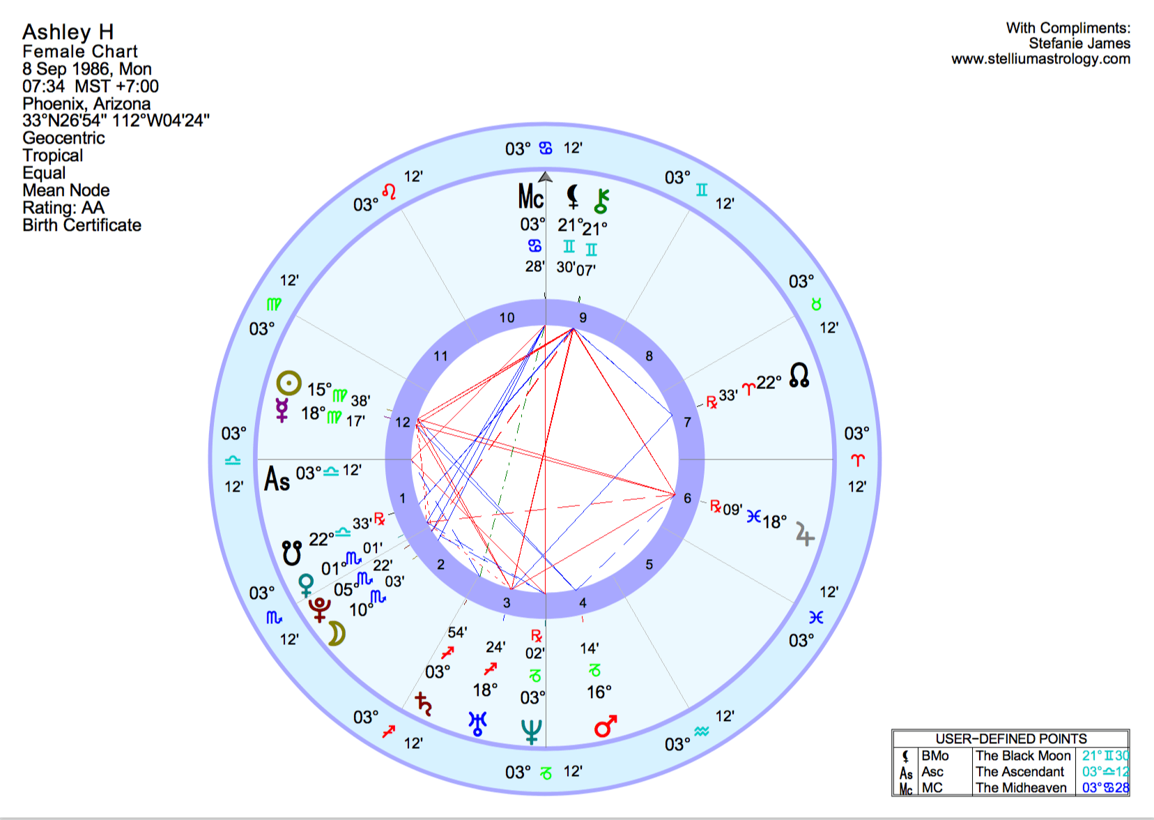 Ashley has a Moon–Pluto conjunction. Venus is in the mix, too. This is a powerfully attractive combination and some people with Venus–Pluto contact may experience unwanted attention from secret admirers! In the second house of values and possessions, the process of rebirth and the phoenix rising from the ashes may apply to her living situation, and she may have had many transformations as far as her home and location may be concerned. This may apply to her self-worth, too.