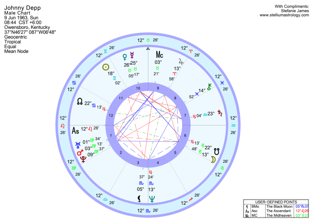 Below is Johnny Depp’s aspect grid in the format you would find it on the Astro Data Bank at astro.com.